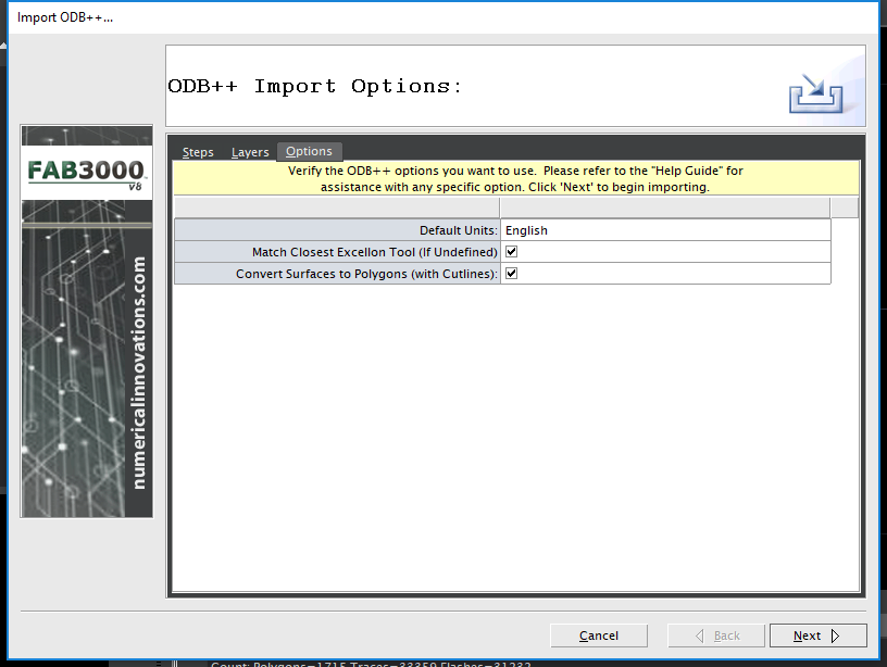 Note: Please be patient. Depending on the complexity of the ODB++ surfaces, it may take Fab3000 several minutes during ODB++ import to convert the surfaces to polygons.